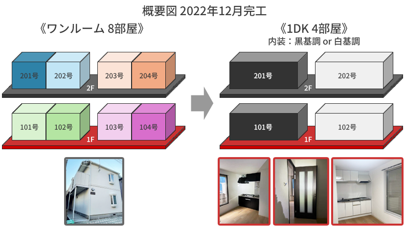 改修前の8部屋から、改修後は4部屋にして住居スペースを3倍に、外壁は遮熱塗料、窓ガラスはペアガラス化によって、外部環境負荷を最大限抑制