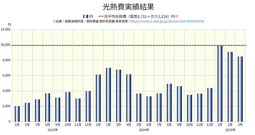 グラフは電気代の支払金額、赤点線は「総務省統計 東京単身者の月平均値」であり、当社の寮光熱費約半分(48%)のため、経済的・社会的に脱炭素へも貢献しています。